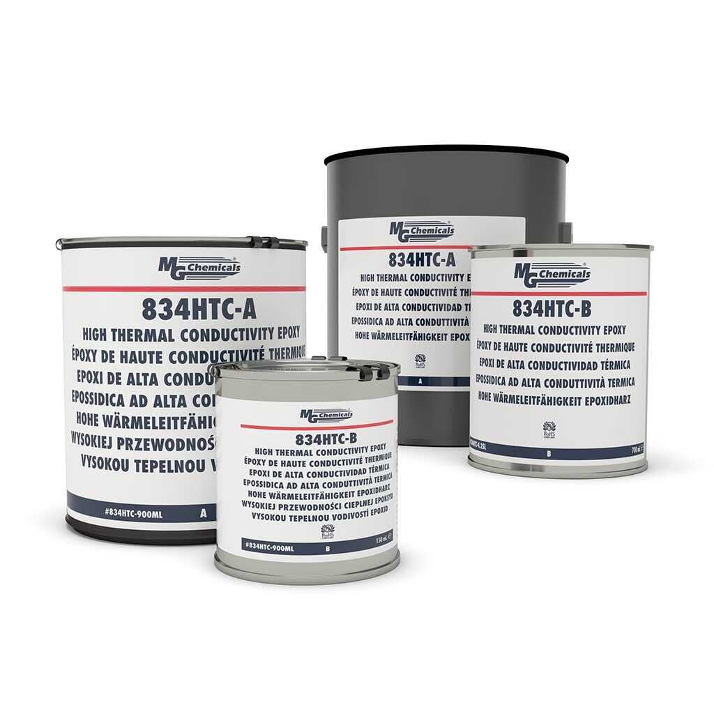 MG Chemicals 834HTC High Thermal Conductivity Epoxy Encapsulating & Potting Compound, elektronik bileşenlerin kapsüllenmesi ve potting işlemleri sırasında yüksek ısıl iletkenlik gerektiren uygulamalar için geliştirilmiş epoksi bazlı bir dolgu malzemesidir. Yüksek termal iletkenliği sayesinde ısı üreten bileşenlerden ısının etkin şekilde uzaklaştırılmasına yardımcı olur. Sertleştiğinde güçlü mekanik dayanım ve yüksek elektriksel izolasyon sunar. Ürün 900 mL, 4.25 L ve 45 L ambalaj seçenekleriyle sunulmaktadır.
